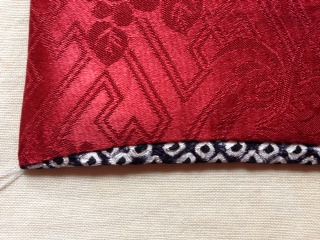 衿先。 八掛は茜色に紗綾形(さやがた)に菊の綸子。